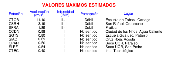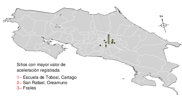 Intensidades en sitios de registro.Cada uno de los cuadrados en el mapa corresponde a la ubicación de un acelerógrafo al momento del sismo. Estos se muestran en distintos colores según la escala mostrada al pie de la figura.