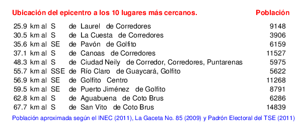 Mapa de la zona epicentral. Se muestran las poblaciones más cercanas al epicentro y fallas activas. Abajo están las distancias que hay del epicentro a cada uno de los diez sitios más cercanos y la cantidad de habitantes que poseen.