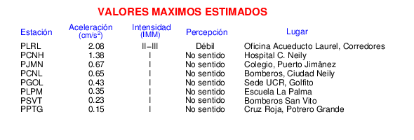 Intensidades en sitios de registro.Cada uno de los cuadrados en el mapa corresponde a la ubicación de un acelerógrafo al momento del sismo. Estos se muestran en distintos colores según la escala mostrada al pie de la figura.