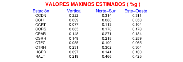 La siguiente tabla muestra los datos de aceleración máxima para cada componente en porcentaje de la aceleración de la gravedad (%g). Estos se obtienen dividiendo el valor del PGA registrado por 980 cm/s2 y multiplicándolo por 100.