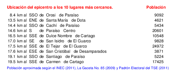 Mapa de la zona epicentral. Se muestran las poblaciones más cercanas al epicentro y fallas activas. Abajo están las distancias que hay del epicentro a cada uno de los diez sitios más cercanos y la cantidad de habitantes que poseen.