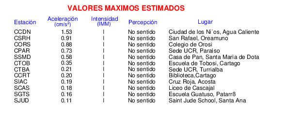 Intensidades en sitios de registro.Cada uno de los cuadrados en el mapa corresponde a la ubicación de un acelerógrafo al momento del sismo. Estos se muestran en distintos colores según la escala mostrada al pie de la figura.