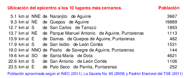 Mapa de la zona epicentral. Se muestran las poblaciones más cercanas al epicentro y fallas activas. Abajo están las distancias que hay del epicentro a cada uno de los diez sitios más cercanos y la cantidad de habitantes que poseen.