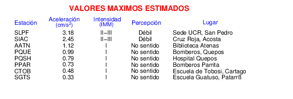 Intensidades en sitios de registro.Cada uno de los cuadrados en el mapa corresponde a la ubicación de un acelerógrafo al momento del sismo. Estos se muestran en distintos colores según la escala mostrada al pie de la figura.