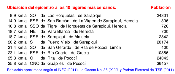 Mapa de la zona epicentral. Se muestran las poblaciones más cercanas al epicentro y fallas activas. Abajo están las distancias que hay del epicentro a cada uno de los diez sitios más cercanos y la cantidad de habitantes que poseen.