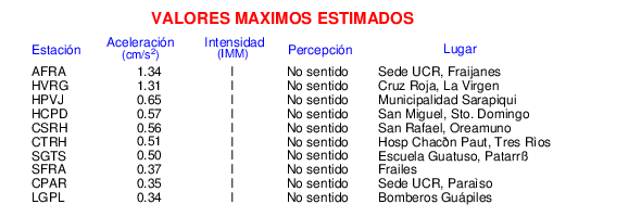 Intensidades en sitios de registro.Cada uno de los cuadrados en el mapa corresponde a la ubicación de un acelerógrafo al momento del sismo. Estos se muestran en distintos colores según la escala mostrada al pie de la figura.