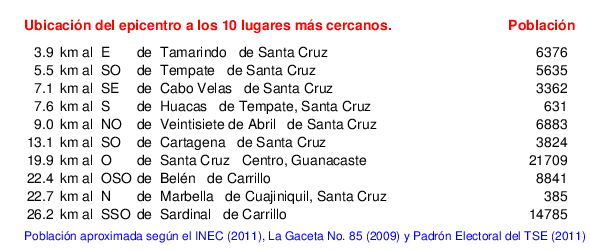 Mapa de la zona epicentral. Se muestran las poblaciones más cercanas al epicentro y fallas activas. Abajo están las distancias que hay del epicentro a cada uno de los diez sitios más cercanos y la cantidad de habitantes que poseen.