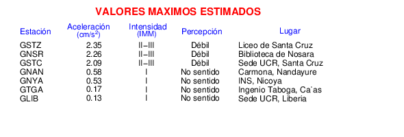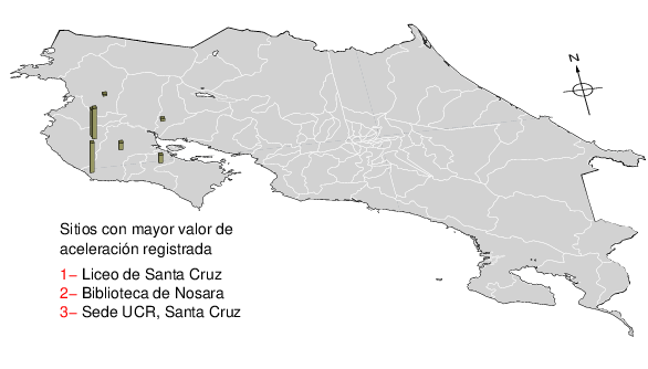 Intensidades en sitios de registro.Cada uno de los cuadrados en el mapa corresponde a la ubicación de un acelerógrafo al momento del sismo. Estos se muestran en distintos colores según la escala mostrada al pie de la figura.