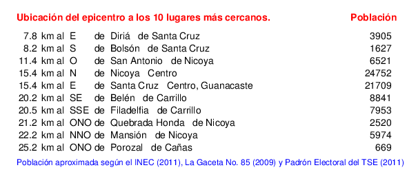 Mapa de la zona epicentral. Se muestran las poblaciones más cercanas al epicentro y fallas activas. Abajo están las distancias que hay del epicentro a cada uno de los diez sitios más cercanos y la cantidad de habitantes que poseen.