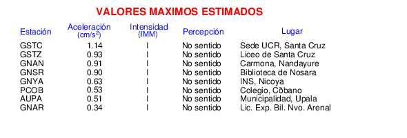Intensidades en sitios de registro.Cada uno de los cuadrados en el mapa corresponde a la ubicación de un acelerógrafo al momento del sismo. Estos se muestran en distintos colores según la escala mostrada al pie de la figura.