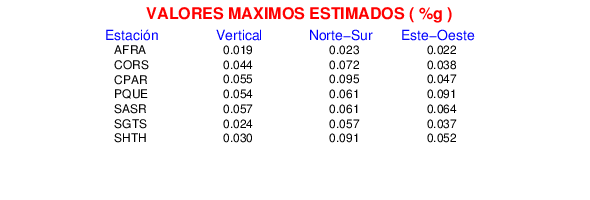 La siguiente tabla muestra los datos de aceleración máxima para cada componente en porcentaje de la aceleración de la gravedad (%g). Estos se obtienen dividiendo el valor del PGA registrado por 980 cm/s2 y multiplicándolo por 100.