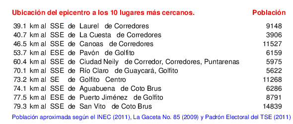 Mapa de la zona epicentral. Se muestran las poblaciones más cercanas al epicentro y fallas activas. Abajo están las distancias que hay del epicentro a cada uno de los diez sitios más cercanos y la cantidad de habitantes que poseen.