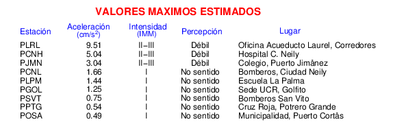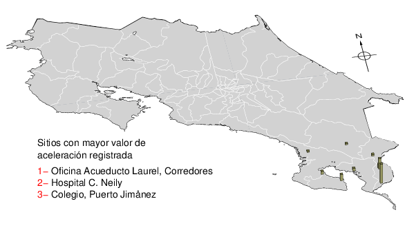 Intensidades en sitios de registro.Cada uno de los cuadrados en el mapa corresponde a la ubicación de un acelerógrafo al momento del sismo. Estos se muestran en distintos colores según la escala mostrada al pie de la figura.