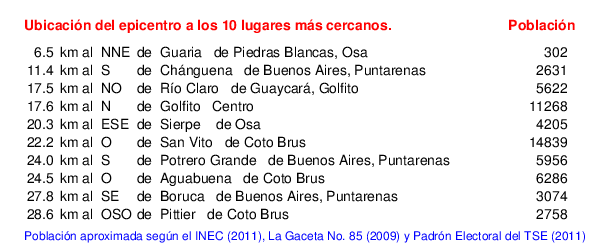Mapa de la zona epicentral. Se muestran las poblaciones más cercanas al epicentro y fallas activas. Abajo están las distancias que hay del epicentro a cada uno de los diez sitios más cercanos y la cantidad de habitantes que poseen.