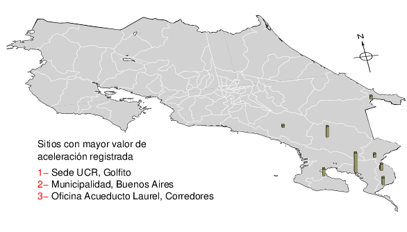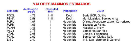 Intensidades en sitios de registro.Cada uno de los cuadrados en el mapa corresponde a la ubicación de un acelerógrafo al momento del sismo. Estos se muestran en distintos colores según la escala mostrada al pie de la figura.