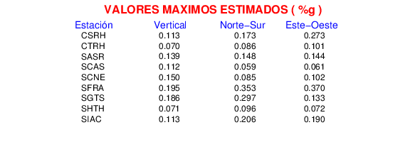 La siguiente tabla muestra los datos de aceleración máxima para cada componente en porcentaje de la aceleración de la gravedad (%g). Estos se obtienen dividiendo el valor del PGA registrado por 980 cm/s2 y multiplicándolo por 100.