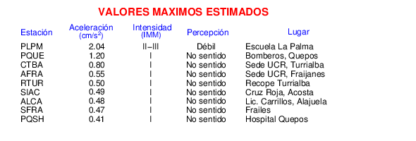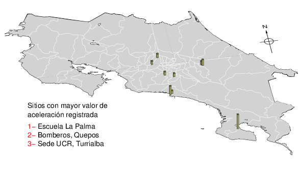 Intensidades en sitios de registro.Cada uno de los cuadrados en el mapa corresponde a la ubicación de un acelerógrafo al momento del sismo. Estos se muestran en distintos colores según la escala mostrada al pie de la figura.