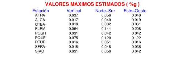 La siguiente tabla muestra los datos de aceleración máxima para cada componente en porcentaje de la aceleración de la gravedad (%g). Estos se obtienen dividiendo el valor del PGA registrado por 980 cm/s2 y multiplicándolo por 100.