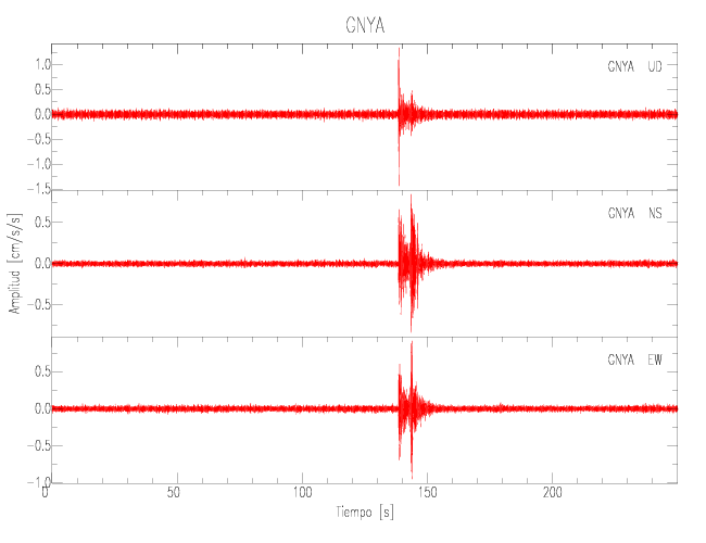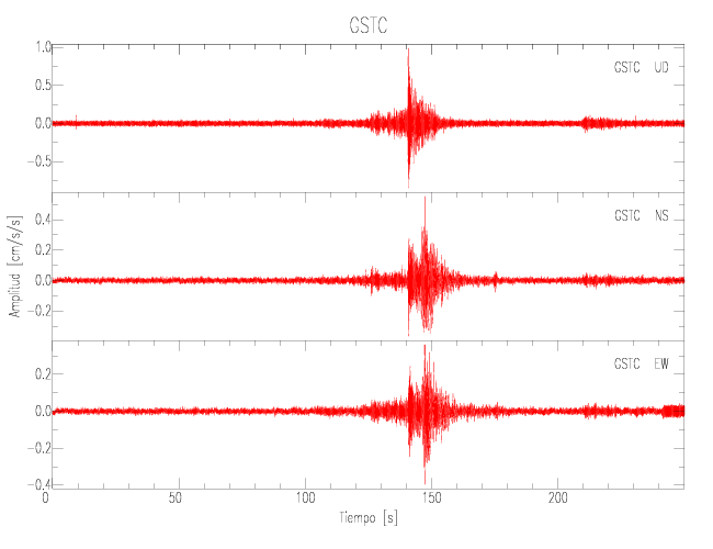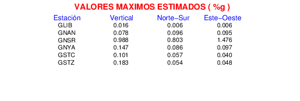 La siguiente tabla muestra los datos de aceleración máxima para cada componente en porcentaje de la aceleración de la gravedad (%g). Estos se obtienen dividiendo el valor del PGA registrado por 980 cm/s2 y multiplicándolo por 100.
