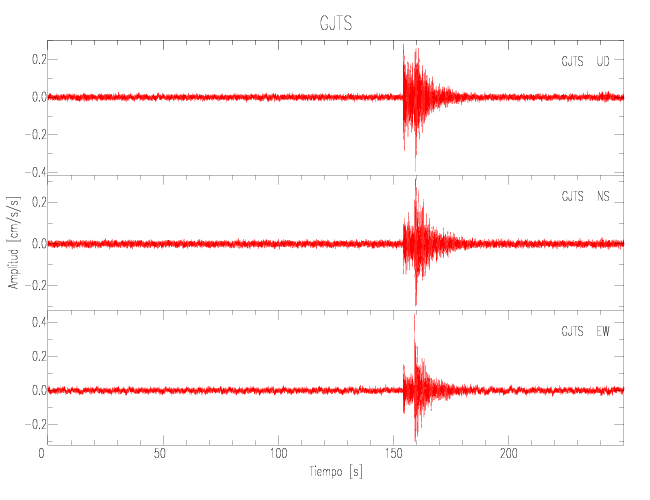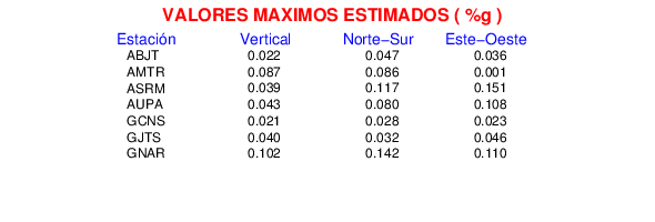 La siguiente tabla muestra los datos de aceleración máxima para cada componente en porcentaje de la aceleración de la gravedad (%g). Estos se obtienen dividiendo el valor del PGA registrado por 980 cm/s2 y multiplicándolo por 100.