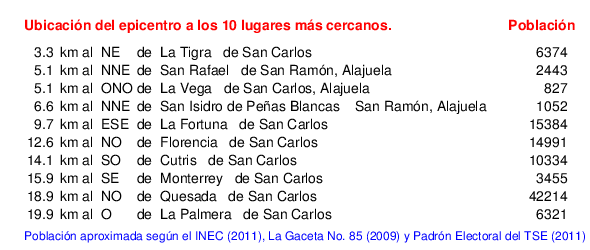 Mapa de la zona epicentral. Se muestran las poblaciones más cercanas al epicentro y fallas activas. Abajo están las distancias que hay del epicentro a cada uno de los diez sitios más cercanos y la cantidad de habitantes que poseen.