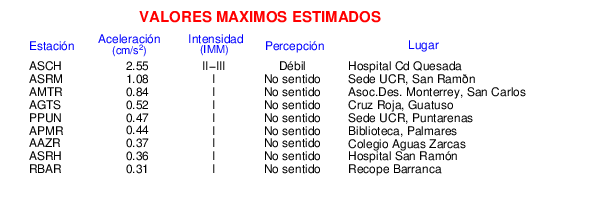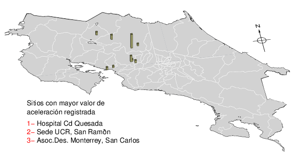 Intensidades en sitios de registro.Cada uno de los cuadrados en el mapa corresponde a la ubicación de un acelerógrafo al momento del sismo. Estos se muestran en distintos colores según la escala mostrada al pie de la figura.