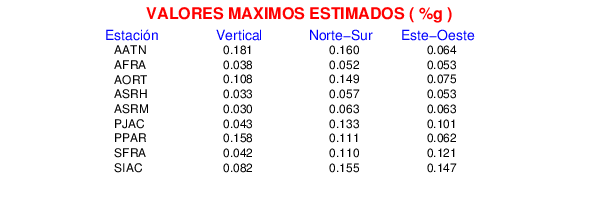La siguiente tabla muestra los datos de aceleración máxima para cada componente en porcentaje de la aceleración de la gravedad (%g). Estos se obtienen dividiendo el valor del PGA registrado por 980 cm/s2 y multiplicándolo por 100.