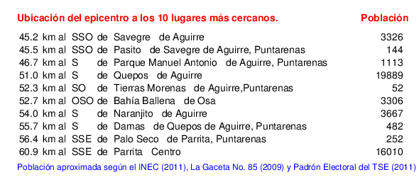 Mapa de la zona epicentral. Se muestran las poblaciones más cercanas al epicentro y fallas activas. Abajo están las distancias que hay del epicentro a cada uno de los diez sitios más cercanos y la cantidad de habitantes que poseen.