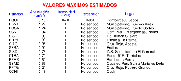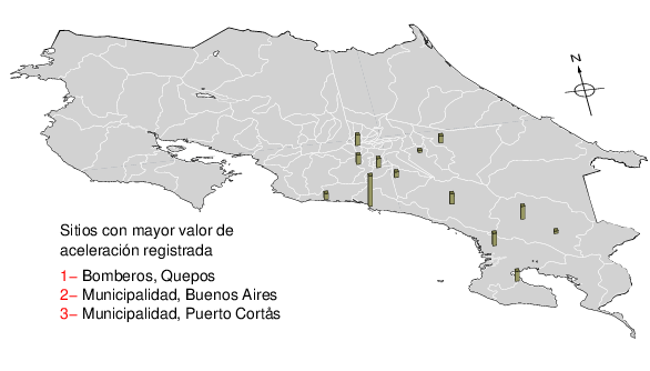 Intensidades en sitios de registro.Cada uno de los cuadrados en el mapa corresponde a la ubicación de un acelerógrafo al momento del sismo. Estos se muestran en distintos colores según la escala mostrada al pie de la figura.