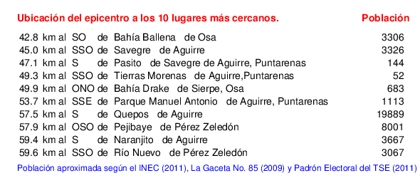 Mapa de la zona epicentral. Se muestran las poblaciones más cercanas al epicentro y fallas activas. Abajo están las distancias que hay del epicentro a cada uno de los diez sitios más cercanos y la cantidad de habitantes que poseen.