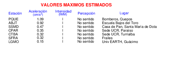 Intensidades en sitios de registro.Cada uno de los cuadrados en el mapa corresponde a la ubicación de un acelerógrafo al momento del sismo. Estos se muestran en distintos colores según la escala mostrada al pie de la figura.