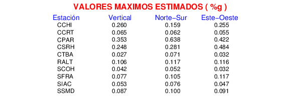 La siguiente tabla muestra los datos de aceleración máxima para cada componente en porcentaje de la aceleración de la gravedad (%g). Estos se obtienen dividiendo el valor del PGA registrado por 980 cm/s2 y multiplicándolo por 100.