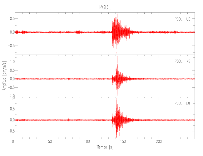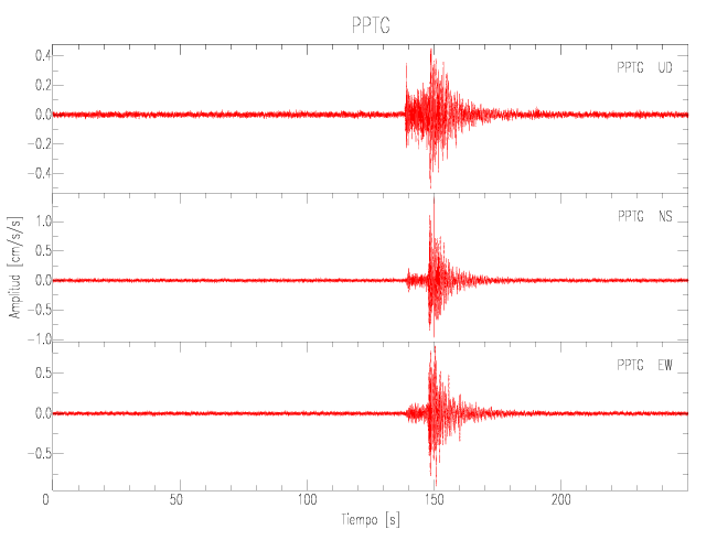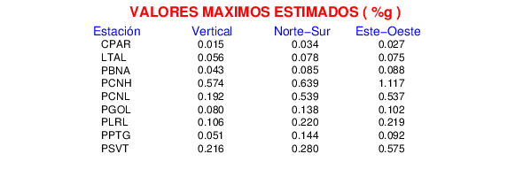 La siguiente tabla muestra los datos de aceleración máxima para cada componente en porcentaje de la aceleración de la gravedad (%g). Estos se obtienen dividiendo el valor del PGA registrado por 980 cm/s2 y multiplicándolo por 100.