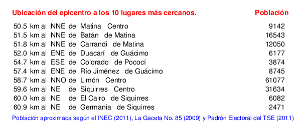 Mapa de la zona epicentral. Se muestran las poblaciones más cercanas al epicentro y fallas activas. Abajo están las distancias que hay del epicentro a cada uno de los diez sitios más cercanos y la cantidad de habitantes que poseen.