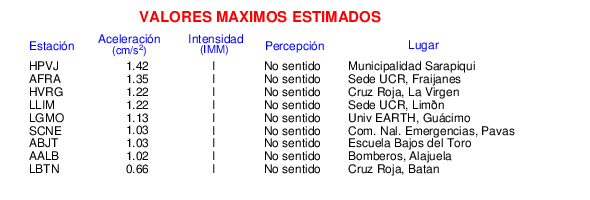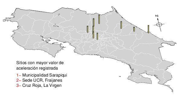 Intensidades en sitios de registro.Cada uno de los cuadrados en el mapa corresponde a la ubicación de un acelerógrafo al momento del sismo. Estos se muestran en distintos colores según la escala mostrada al pie de la figura.