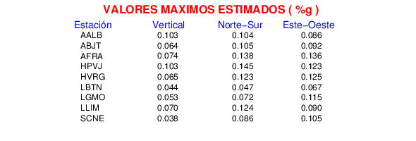 La siguiente tabla muestra los datos de aceleración máxima para cada componente en porcentaje de la aceleración de la gravedad (%g). Estos se obtienen dividiendo el valor del PGA registrado por 980 cm/s2 y multiplicándolo por 100.