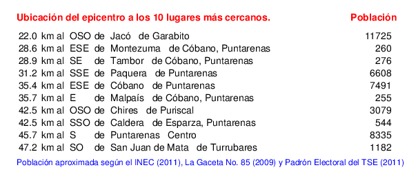 Mapa de la zona epicentral. Se muestran las poblaciones más cercanas al epicentro y fallas activas. Abajo están las distancias que hay del epicentro a cada uno de los diez sitios más cercanos y la cantidad de habitantes que poseen.