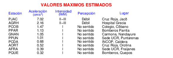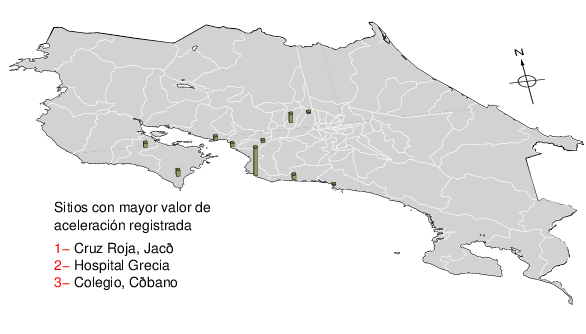 Intensidades en sitios de registro.Cada uno de los cuadrados en el mapa corresponde a la ubicación de un acelerógrafo al momento del sismo. Estos se muestran en distintos colores según la escala mostrada al pie de la figura.