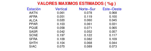 La siguiente tabla muestra los datos de aceleración máxima para cada componente en porcentaje de la aceleración de la gravedad (%g). Estos se obtienen dividiendo el valor del PGA registrado por 980 cm/s2 y multiplicándolo por 100.