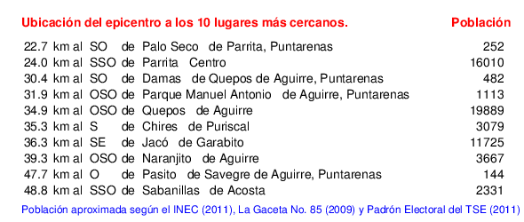 Mapa de la zona epicentral. Se muestran las poblaciones más cercanas al epicentro y fallas activas. Abajo están las distancias que hay del epicentro a cada uno de los diez sitios más cercanos y la cantidad de habitantes que poseen.