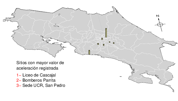 Intensidades en sitios de registro.Cada uno de los cuadrados en el mapa corresponde a la ubicación de un acelerógrafo al momento del sismo. Estos se muestran en distintos colores según la escala mostrada al pie de la figura.