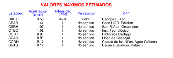 Intensidades en sitios de registro.Cada uno de los cuadrados en el mapa corresponde a la ubicación de un acelerógrafo al momento del sismo. Estos se muestran en distintos colores según la escala mostrada al pie de la figura.