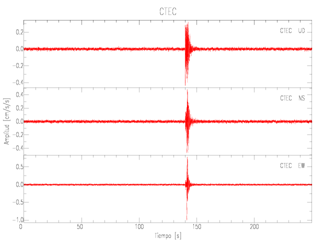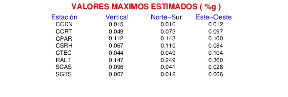 La siguiente tabla muestra los datos de aceleración máxima para cada componente en porcentaje de la aceleración de la gravedad (%g). Estos se obtienen dividiendo el valor del PGA registrado por 980 cm/s2 y multiplicándolo por 100.