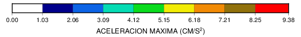 Mapa de valores de aceleración máximos. El mayor valor de aceleración aparecerá en color rojo de acuerdo a la escala proporcionada al pie de la figura.