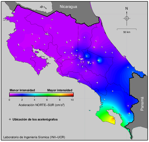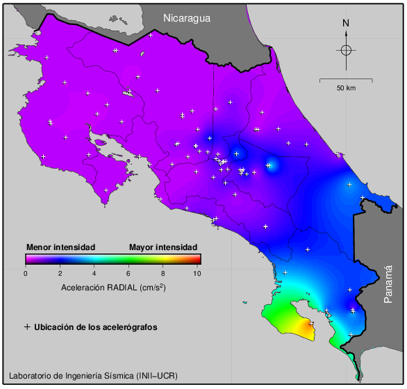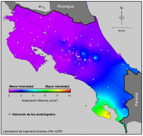 Estos son los valores de PGA de algunos sismos de importancia que han sucedido en Costa Rica desde 1990 hasta el presente. El sismo último es mostrado como una estrella roja. El más grande registrado ha sido el del 05 de setiembre del 2012 en Nicoya con una magnitud Mw 7.6. El del 22 de abril de 1991 en el Valle de la Estrella también fue igualmente grande, sin embargo, en ese entonces la cobertura de la red se limitaba al Valle Central, por lo que no se obtuvieron registros cerca del epicentro.