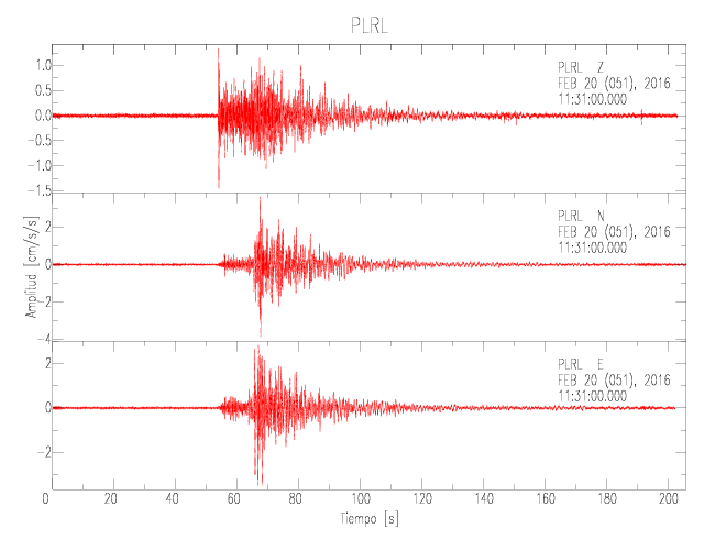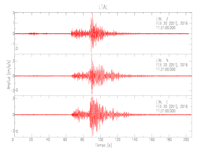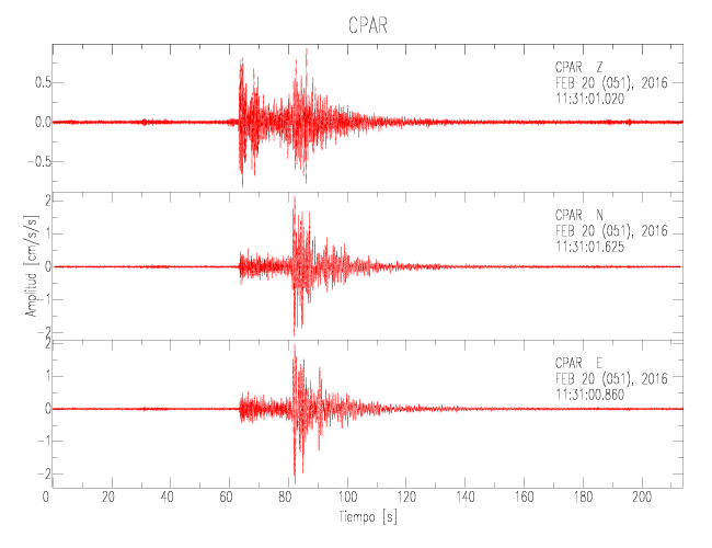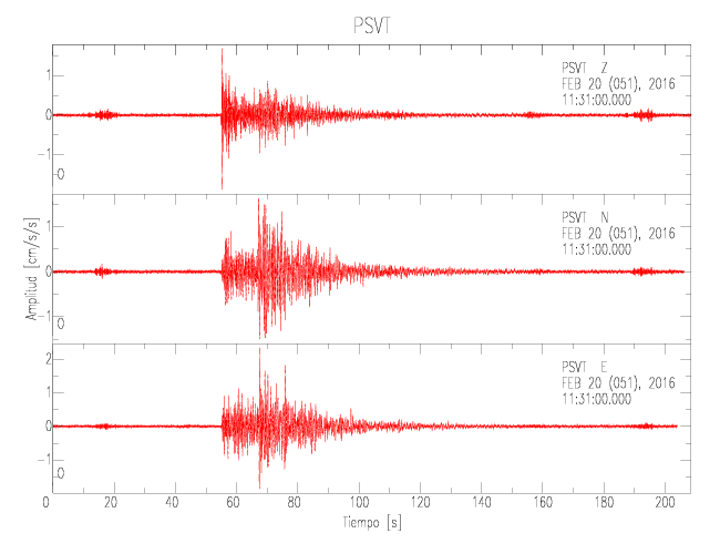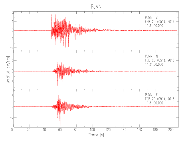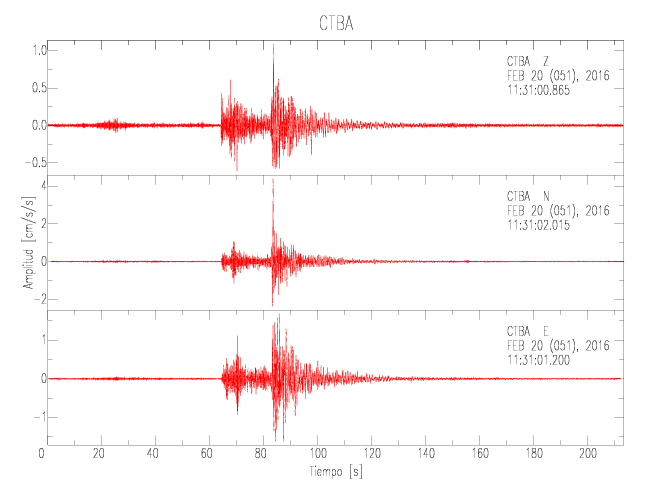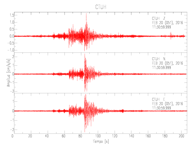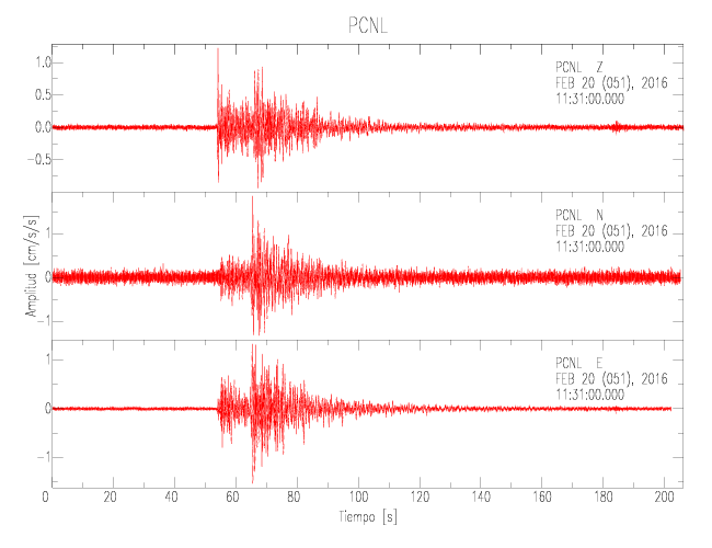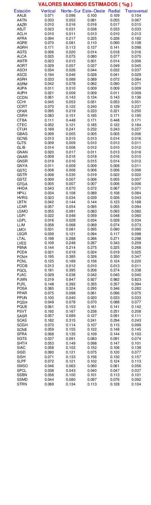La siguiente tabla muestra los datos de aceleración máxima para cada componente en porcentaje de la aceleración de la gravedad (%g). Estos se obtienen dividiendo el valor del PGA registrado por 980 cm/s2 y multiplicándolo por 100. Las estaciones se listan en orden alfabético. Los valores de las últimas dos columnas corresponden a la componente radial y transversal.