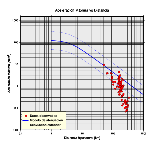 Datos del valor de la aceleración máxima (PGA por sus siglas en inglés) de cada estación (puntos rojos) en función de la distancia al hipocentro. Las trazas azules corresponden al modelo de atenuación y su respectiva desviación estándar.