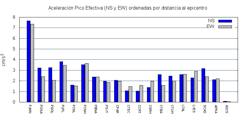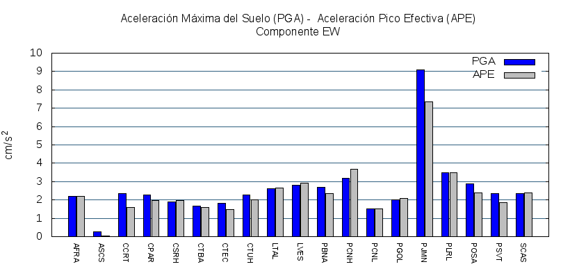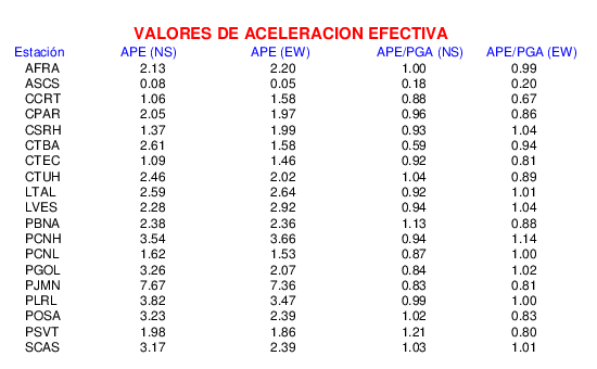 La siguiente tabla muestra los valores de aceleración efectiva para las componentes norte-sur (NS) y este-oeste (EW). También se muestra el valor del cociente entre la aceleración efectiva y la aceleración máxima (APE/PGA).