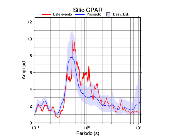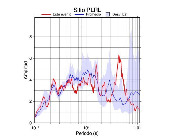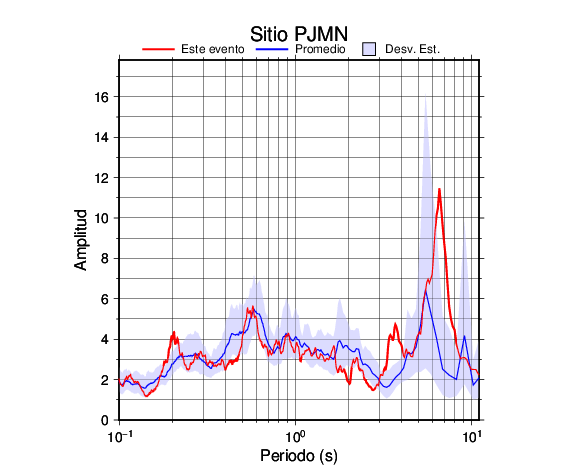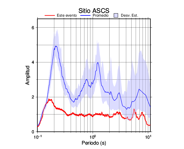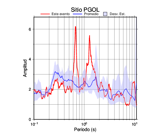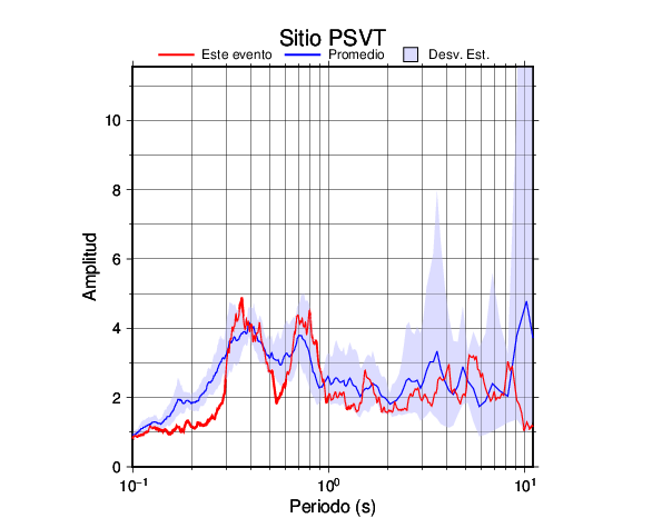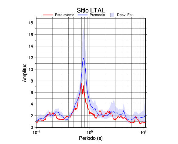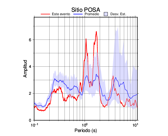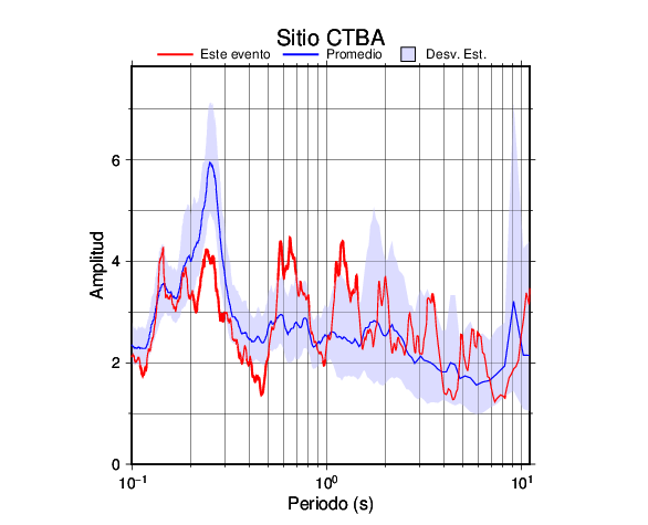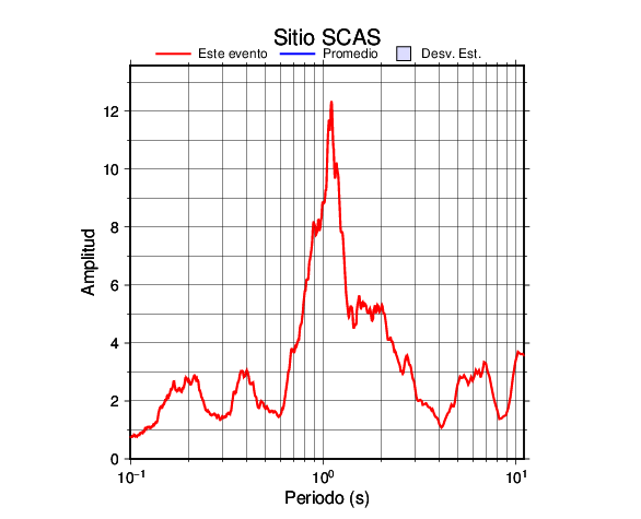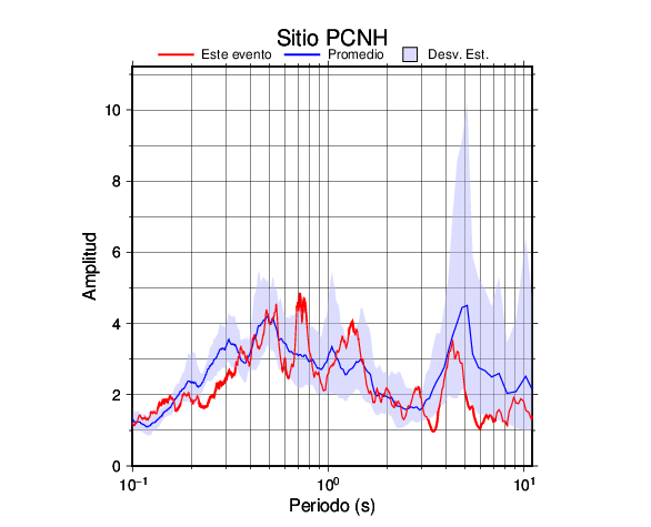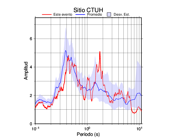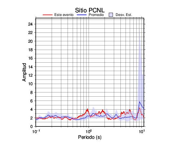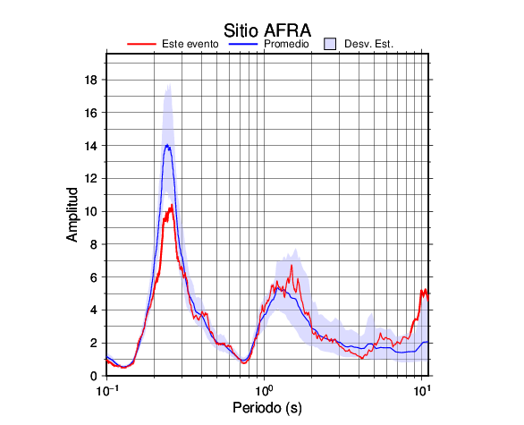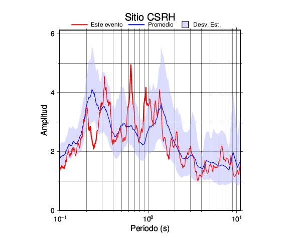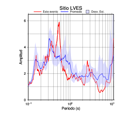 Los resultados que se presentan aquí fueron obtenidos luego de dividir las componentes horizontales entre la componente vertical (conocido como técnica H/V). Se grafica tanto el efecto de sitio del sismo registrado como el valor promedio en cada estación y su correspondiente desviación estándar.