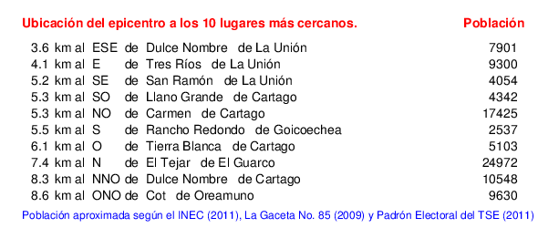 Mapa de la zona epicentral. Se muestran las poblaciones más cercanas al epicentro y fallas activas. Abajo están las distancias que hay del epicentro a cada uno de los diez sitios más cercanos y la cantidad de habitantes que poseen.